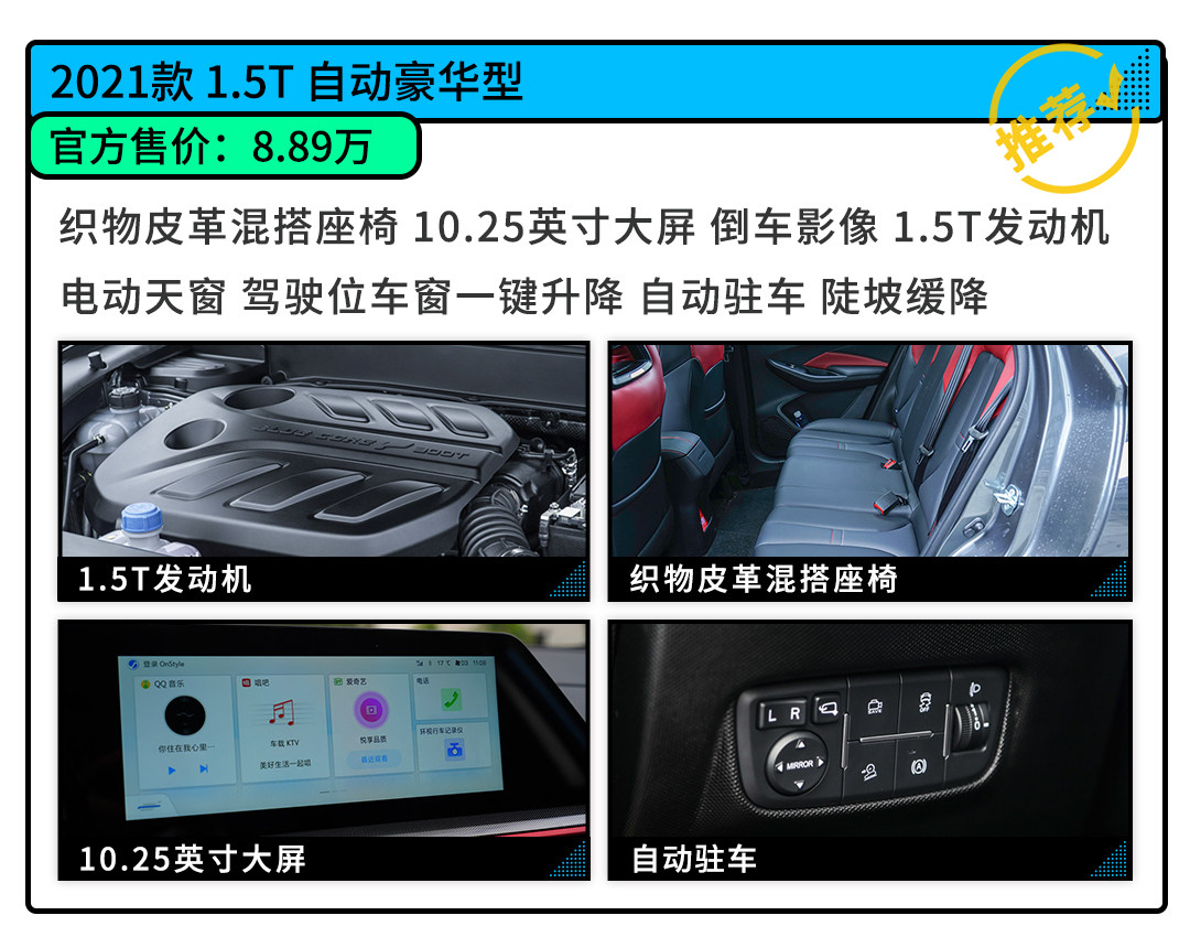 因为1.6L发动机最大功率只有128马力,而1.5T发动机最大功率却高达180马力,足足52马力的差距,在日常行驶式区别也会很明显。其中1.5T车型最值得购买的是指导价为8.89万元的自动豪华型,相比6.99万元的最低配车型,座椅从织物升级到了织物皮革混搭材质,中控屏也升级到了10.25英寸,并配有倒车影像。