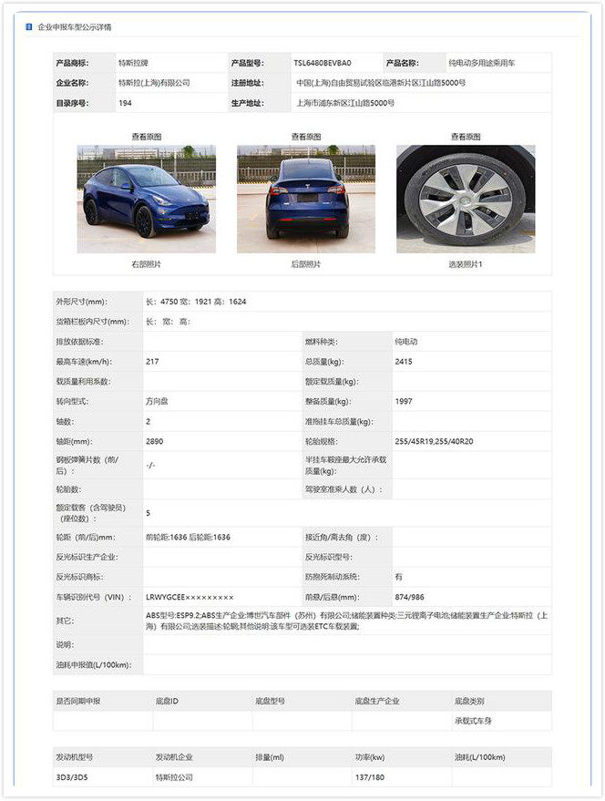 动力方面,根据申报信息,特斯拉Model Y将会推出长续航和高性能两个版本,搭载双驱动电机,输出功率分别达到137kW和180kW;使用三元锂电池组,电池能量密度161Wh/kg,最高可供续航里程594km。