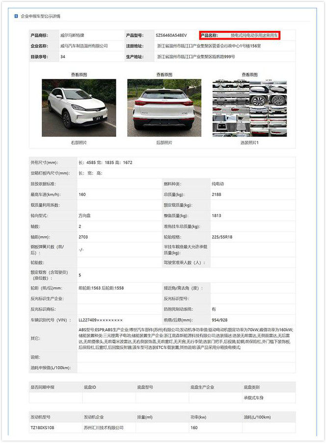 威马EX5是造车新势力品牌威马推出的第一款产品,自上市在市场取得了一定的销量成绩。根据工信部发布的新能源车型申报图来看,威马EX5此次申报的新车与以往不同,是一款支持换电的新产品。