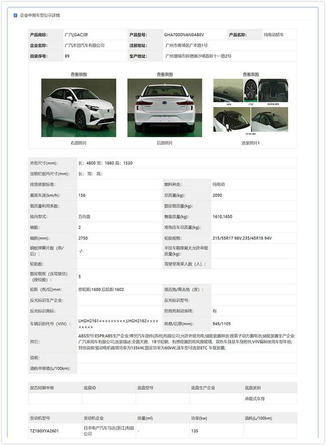 动力方面,目前还没有很详细的信息,申报信息表显示,EA6在动力上会搭载由日本电产汽车马达(浙江)有限公司所生产的驱动电机,最大功率135kW,匹配宁德时代电池组,最大续航里程可能超过500km。