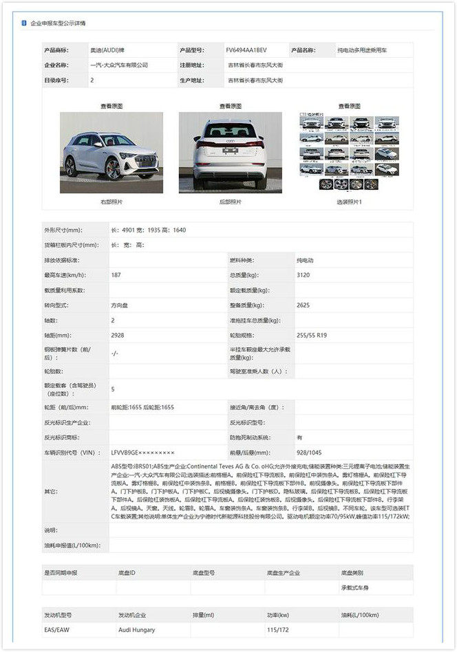 e-tron是奥迪第一款国产车型,也是首款国产纯电动产品。事实上,很早之前,国产奥迪e-tron就已进行过新车申报,根据原有规划,国产车型基于大众新平台MLB evo平台打造,由一汽-大众工厂负责生产和投放市场。