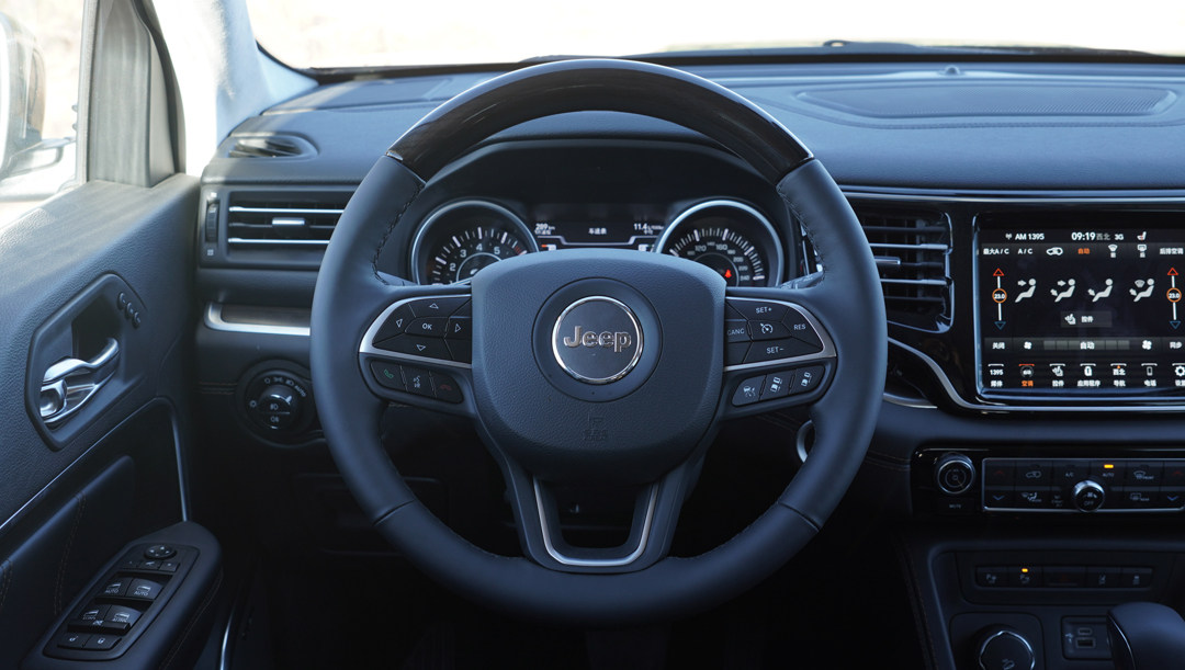 大指挥官的方向盘尺寸适中,在本次试驾的顶配车型上还有桃木装饰,手感温润,相比起皮革,桃木装饰更能引起人们对于美式豪华的共鸣。