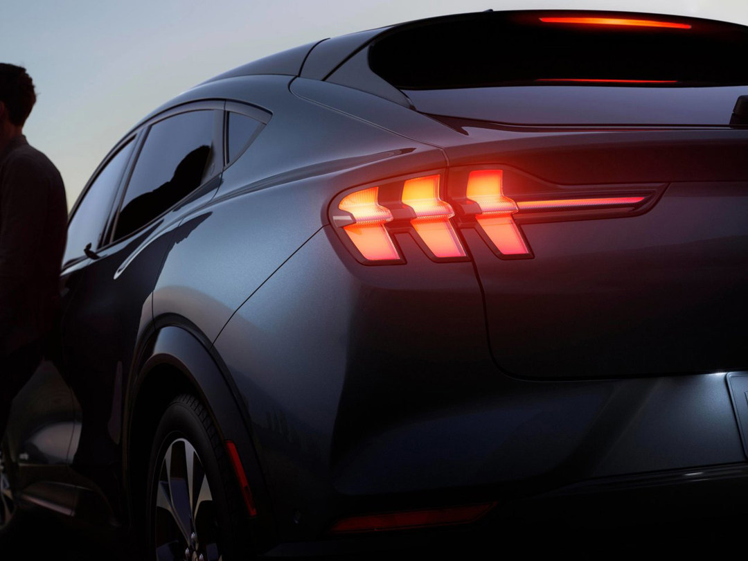 车辆后方的肩线明显向两侧扩张,似乎在强调这强有力的“后肢”,给人一种力量方面的联想。Mustang Mach-E有着明显的溜背造型,更像是一辆轿跑SUV,车尾保留了三条柱状的刹车灯以外,在尾箱盖尾端也有来自Mustang的设计元素。
