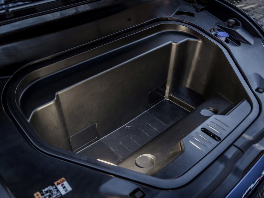 由于车辆使用纯电动平台,所以原本安放发动机的空间被“闲置”,福特将其设计成一个储物箱,这个有个小亮点:该前备厢带有排水槽,据说是方便车主存放冰块……但笔者实在是想不到为什么要在前备厢放冰块……