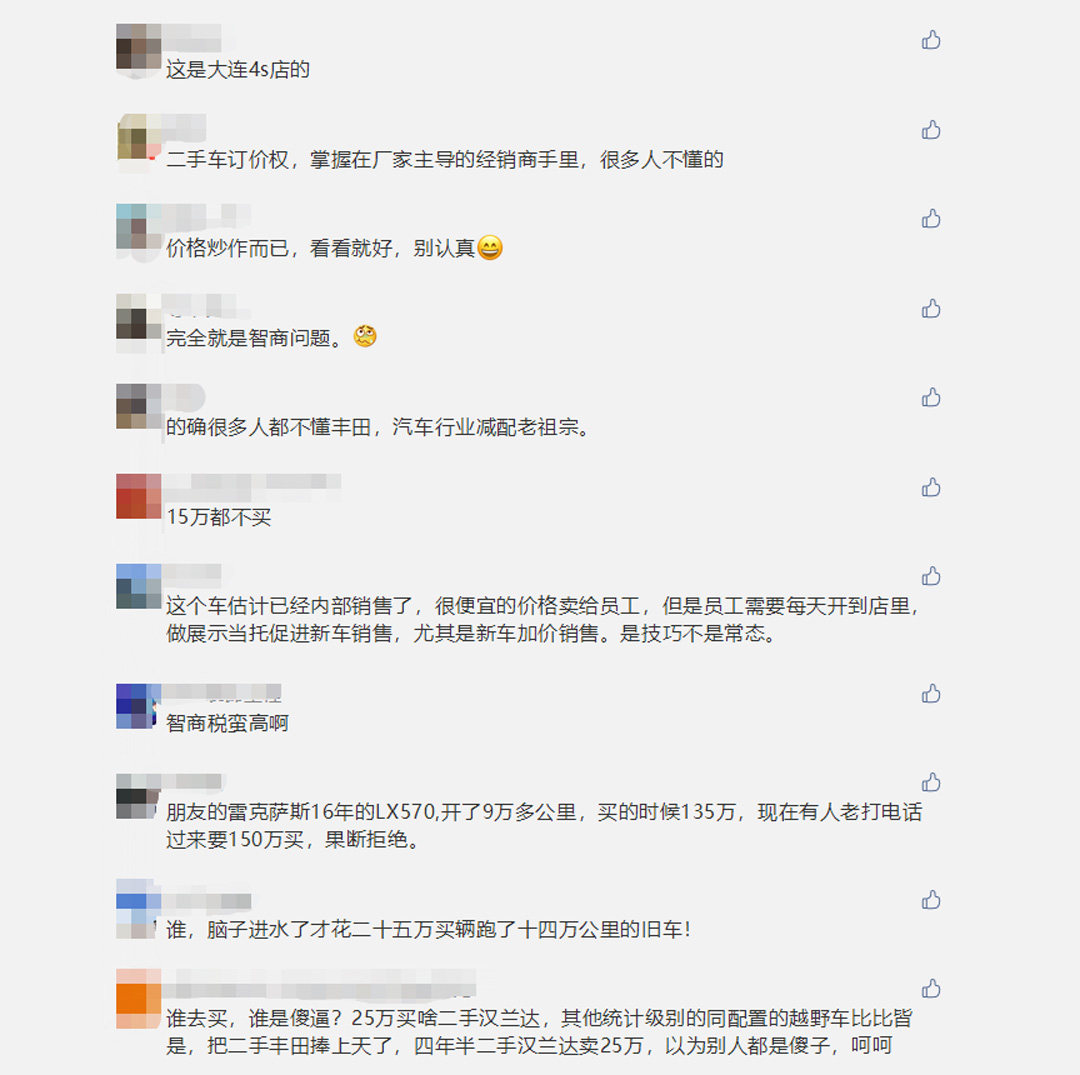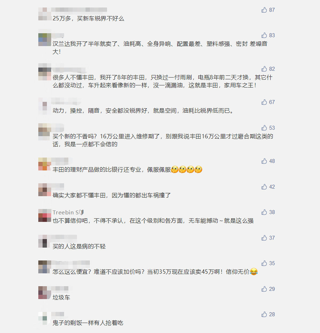 当然,丰田汉兰达的加价销售,二手车被卖出天价,愤怒归愤怒,但实则在保护自己的财产不被缩水,这无可厚非。