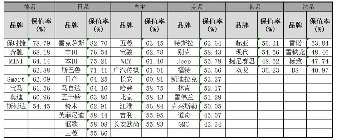 其中,超过70%保值率水平的汽车品牌有五家,而日系品牌占了4家;在保值率排名前十的车企中,日系品牌高达7家,德系品牌有3家,而像美系品牌,韩系品牌,法系品牌以及自主品牌等一众品牌,都未进入保值率前十水平。