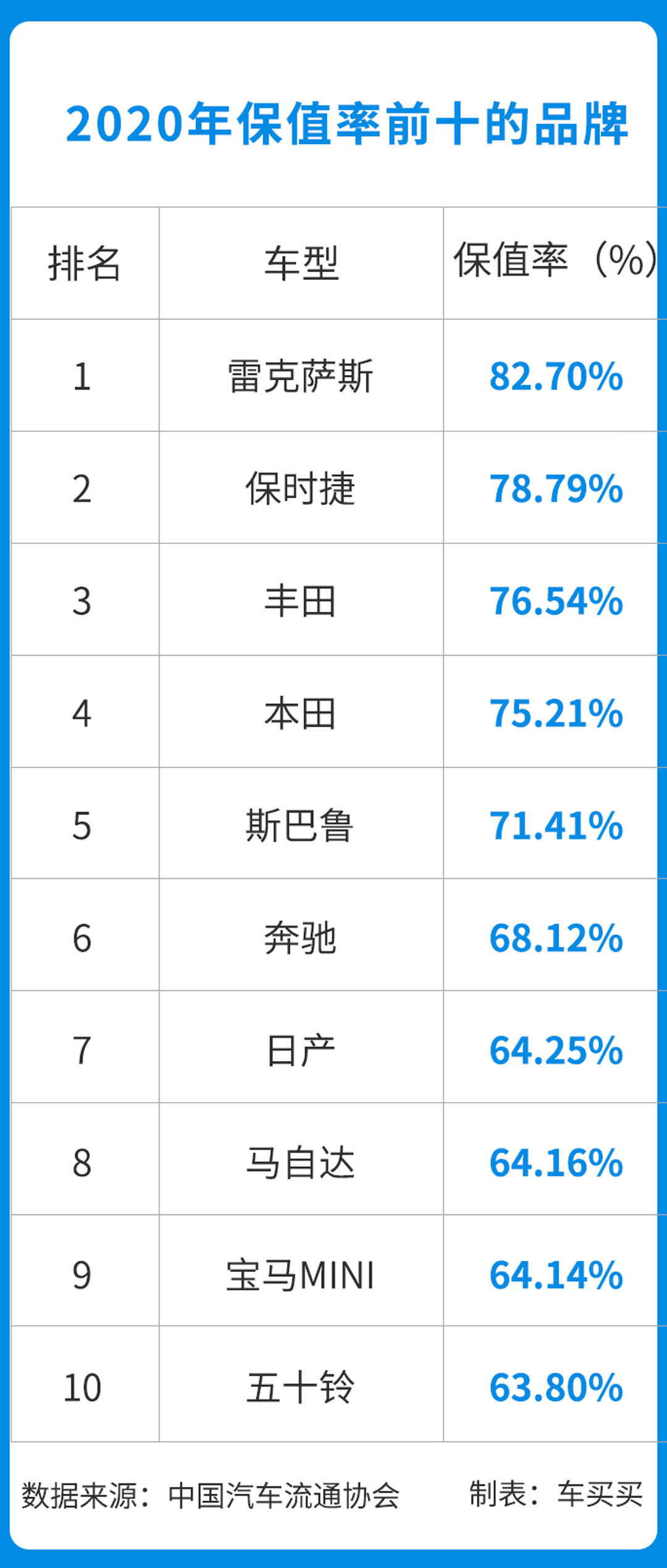 从中国汽车流通协会所公布的《2020中国二手车行业流通发展报告白皮书》中可以看出,国内流通并销售的品牌保值率以雷克萨斯品牌高达82.7%的水平傲视整个汽车界,其次就是出乎意料的保时捷品牌,以78.79%的水平压过丰田品牌一筹,而丰田品牌以76.54%的水平位居第三。