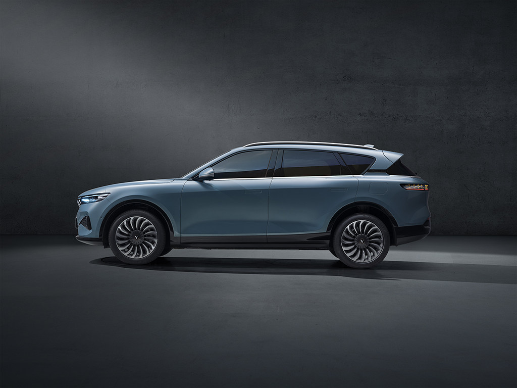 先来说一下这车的本身,新车号称是要打造一款“零焦虑”的中大型新能源动力SUV,在外观上整体的风格其实是与概念车iFree比较接近的,不过前脸格栅采用了类似玛莎拉蒂的直瀑式格栅,并且贯穿式的灯带与车标进行连接,为新车带来了较强的科技感以及辨识度。