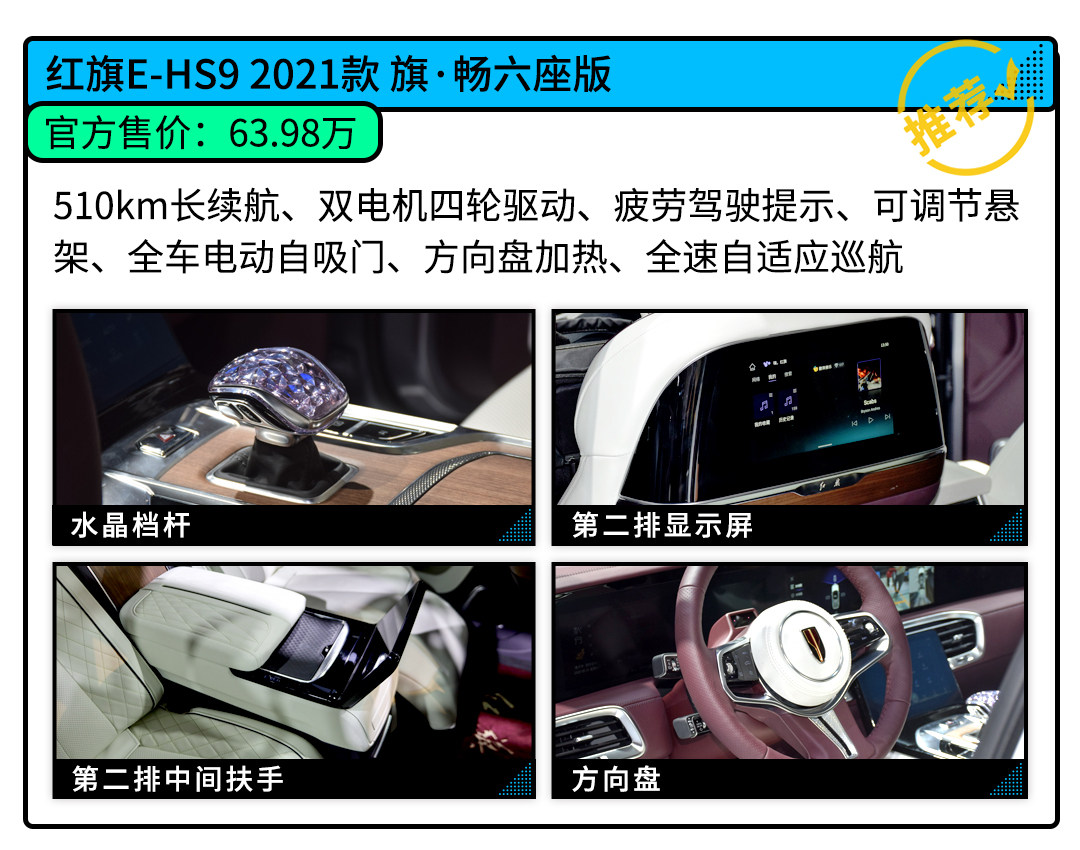 动力方面,红旗E-HS9的4款车型均采用双电机四驱动力,最大扭矩达到750牛·米,最大续航里程为510km。你可能会担心,这么大一台车加上如此大的动力,在城市里开会不会显得笨重和压力大?其实不然,7种驾驶模式、轻盈的转向手感、线性且充足的制动力,都会让你驾驶起来非常轻盈。