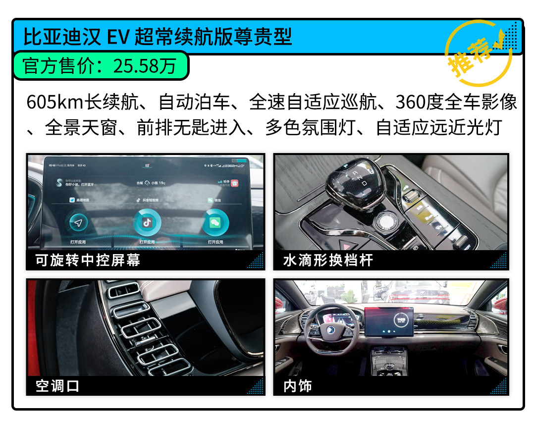如果前两款车觉得空间太小、不够大气,那不妨考虑一下这款轿比亚迪汉EV。作为中国第一个以历代王朝命名的汽车品牌比亚迪,在今年7月份又推出了新款新能源汽车——比亚迪汉。其中三款为纯电动版(比亚迪汉EV),售价在22.98-27.95万元。