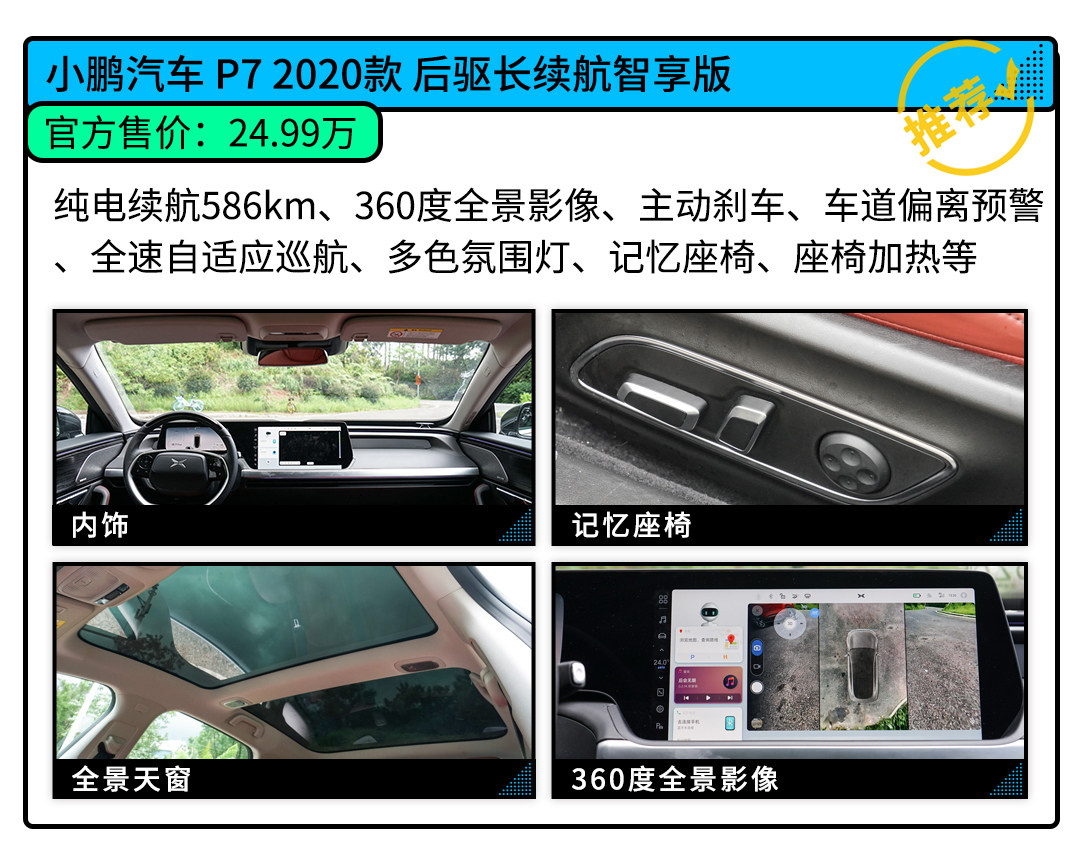 小鹏P7在售共有10款车型,售价在22.99-40.99万之间,满足了目前为止新能源汽车的不同市场需求。有长达706km续航里程的后驱超长续航智行版,也目前为止续航里程最长的新能源汽车;有高达655扭矩的四驱高性能智享版,其动力甚至超过3.0T的保时捷卡宴;还有大鹏展翅般剪刀门的鹏翼版等等。