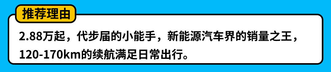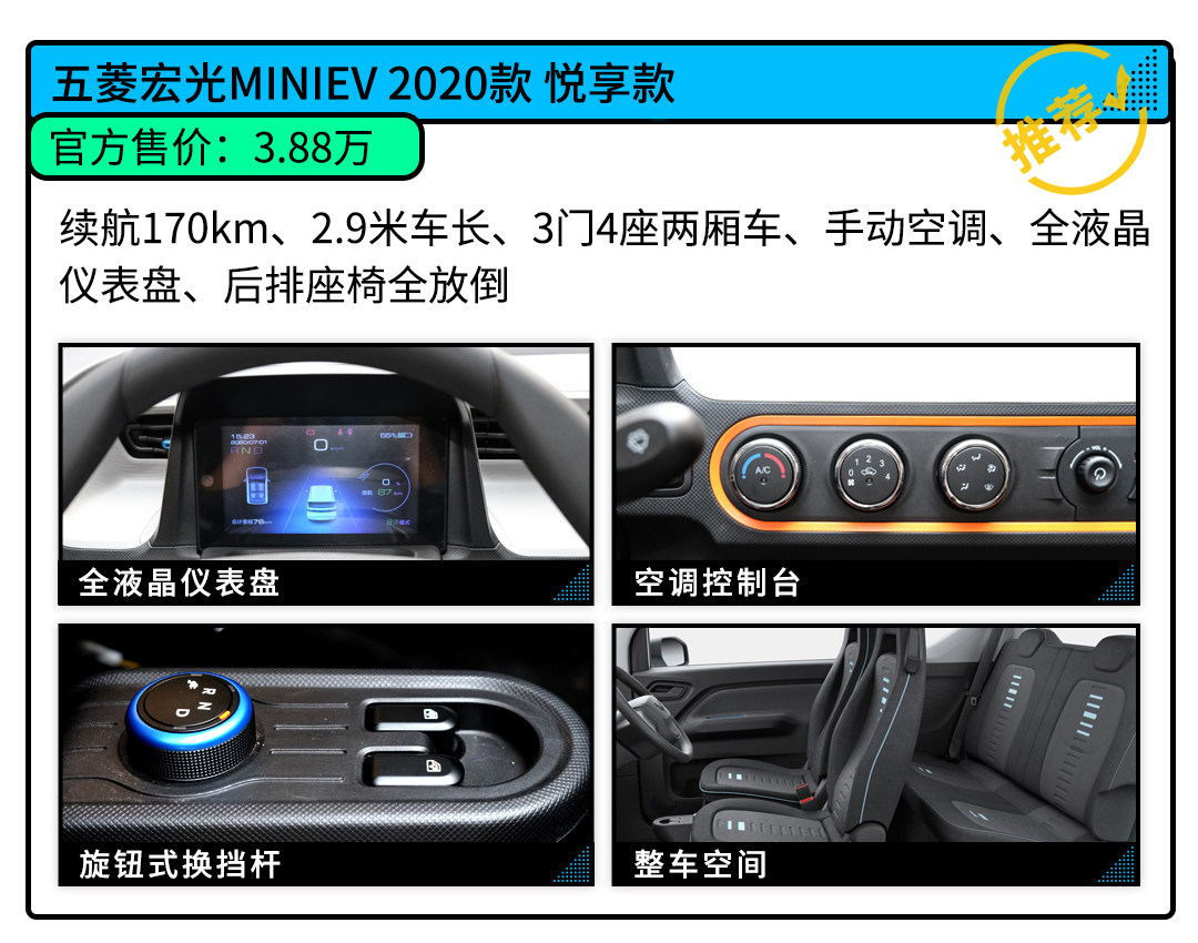 宏光MINIEV售价为2.88-3.88万,纵使你买的是顶配,落地也不过4万出头,最低月供也只要几百块钱,市区代步车的首选。短小精悍的车身,随意穿梭在城市之间,两排4座空间,后排支持一键放倒,120-170KM续航,满足绝大多数家庭日常需求。