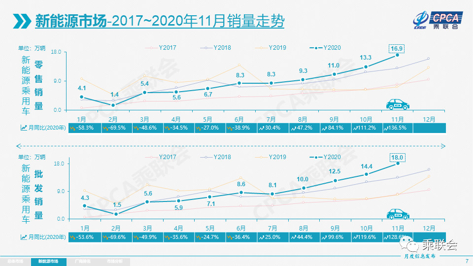 而到了11月新能源乘用车批发销量18.0万辆,同比增长128.6%,环比10月增长24.8%。其中插电混动销量3.0万辆,同比增长160.0%。纯电动的批发销量15.0万辆,同比增长122.3%。