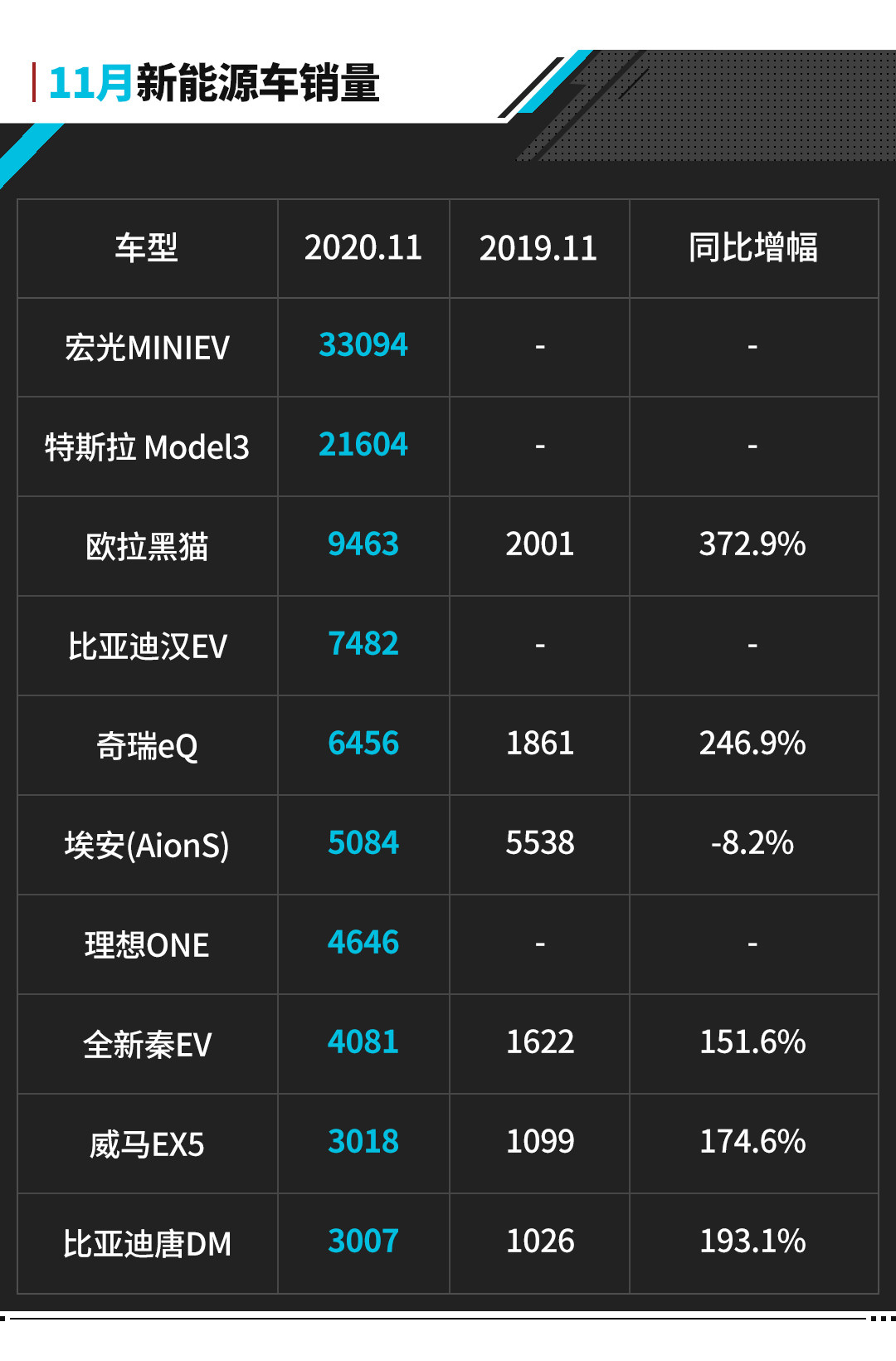 根据乘联会公布的数据,在11月份的销量当中,上汽通用五菱卖出了36070辆、比亚迪卖出了26015辆、特斯拉卖出了中国21604辆,而这前三强就占到了新能源车销量的46.5%。