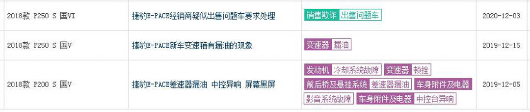 虽然长处很明显,但是缺点也很突出,它继承了品牌的特色——质量问题。在某投诉网站上可以看到,E-PACE的质量问题十分常见,而且均为发动机、变速箱、电子等车辆最重要的部件故障,其中最突出的一位车主更是同时出现了6个故障,你说这么一款车消费者怎么敢买呢?