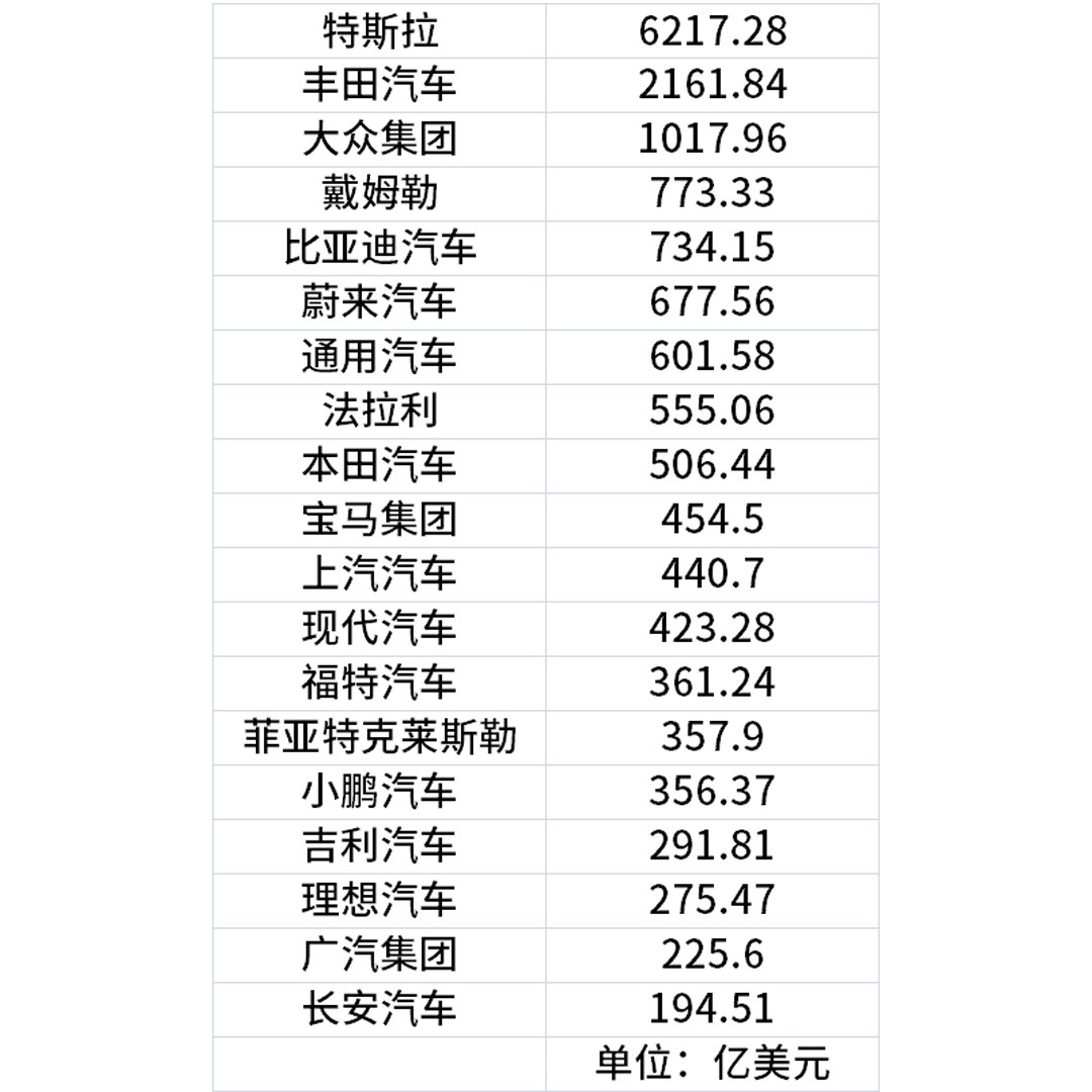 教授统计了一下北京时间12月18日收盘全球汽车厂商的市值排行榜。