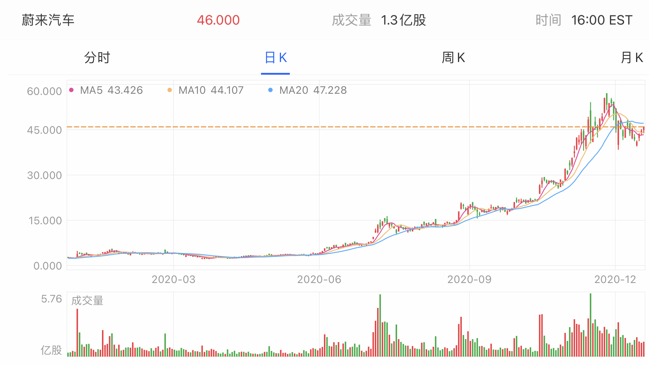 而来到2020,就是蔚来和李斌最开心的一年,从负面中爬出来、熬过疫情的蔚来,股价最高达到57.2美元,今年以来涨幅超过1400%!