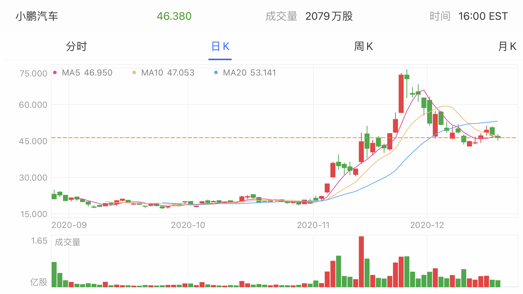 与蔚来一同暴涨的还有小鹏,不过小鹏上市时间并不久,可以聊的并不多,从上市20美元左右的股价,至今股价也都已经在50美元左右,翻了一倍有多,也算是大涨了一波,收益也都比较可观。