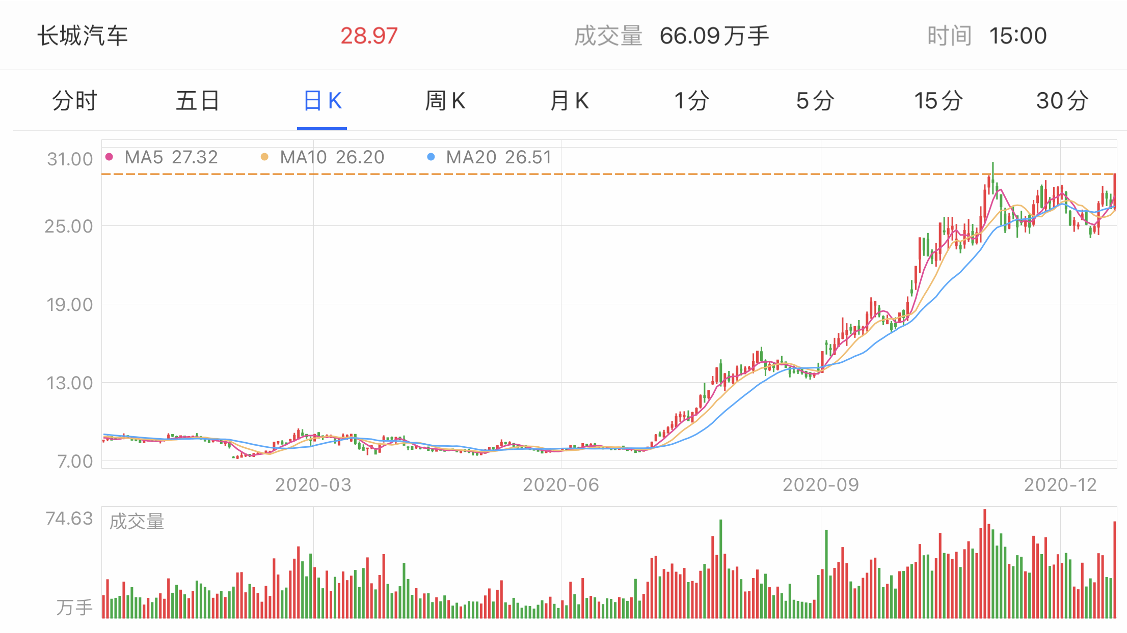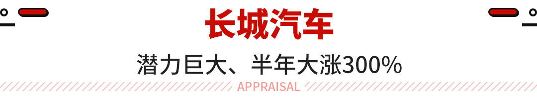 今年前半年,长城汽车的股价也就7、8元,下半年之后就开始起飞,三季度开始,股价已经实现翻倍,涨到17、18元,至今已经向30元冲去,长城汽车股价从年中开始涨幅已达300%有多,也就是从年中开始,只要你入手,肯拿,翻倍都没太大问题。