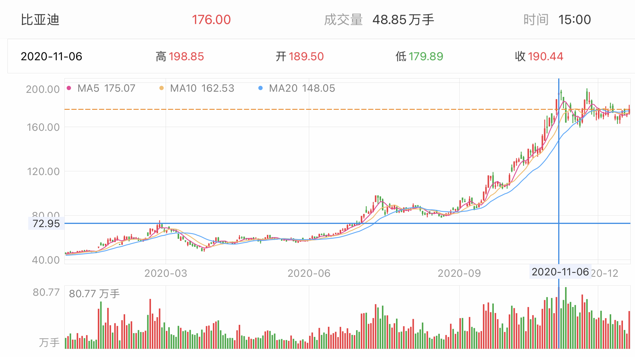 三季度发布财报之后就直接长天,这时候,比亚迪的股价已经达到100元;相比年初市值翻了一倍,其中8-11月上涨11周,涨幅154%,一年涨幅高达3倍。