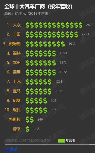 除了市值,更值得关注的是营收,虽然大众的市值只能排到第三,但2019年大众的营收是全球汽车品牌最高的2828亿美元,利润193亿欧元,而特斯拉去年的营收不足特斯拉的10分之1,也是从今年才开始盈利。