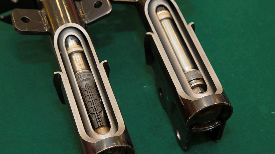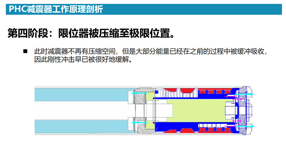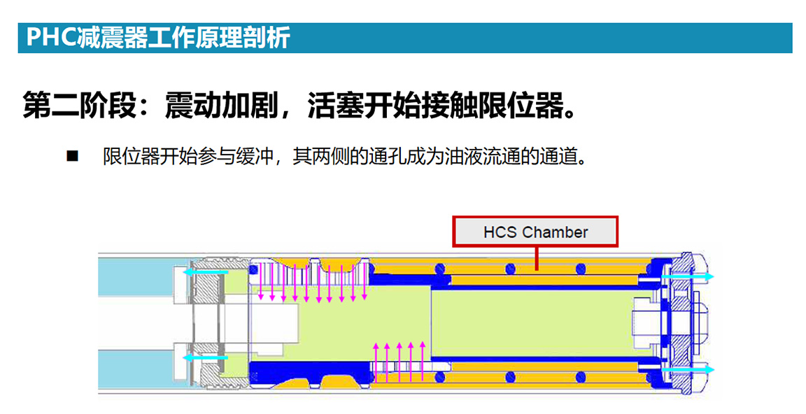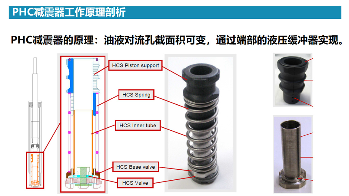PHC全称PROGRESSIVE HYDRAULIC CUSHIONS,直译渐进式液压垫,也就是自适应液压稳定技术,该减振器的最大亮点在于,其在传统液压减振器基础上增加了两个渐进式液压缓冲器(即图中左边减震器所示)。