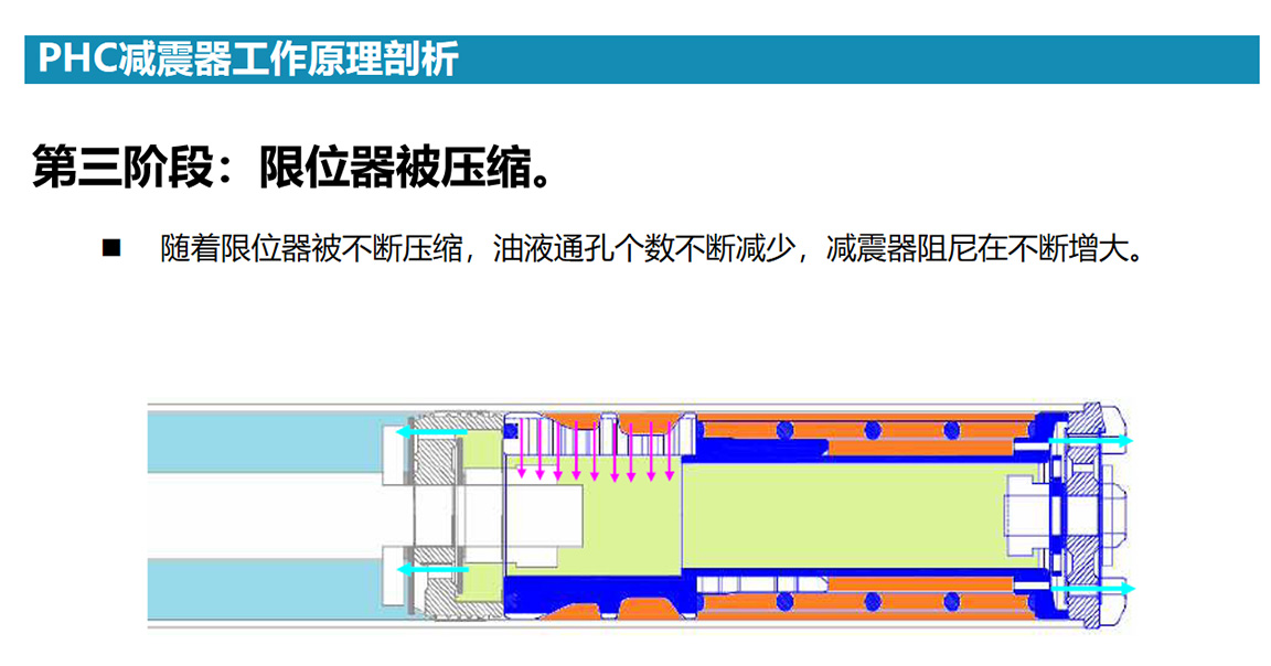 当冲击力不断加剧时,PHC装置就不断被压缩,能通流的节流孔越来越少,因此液体流动阻力继续增加,减震器阻尼继续增大,此时悬架变得更加坚韧,达到化解强硬冲击的作用。