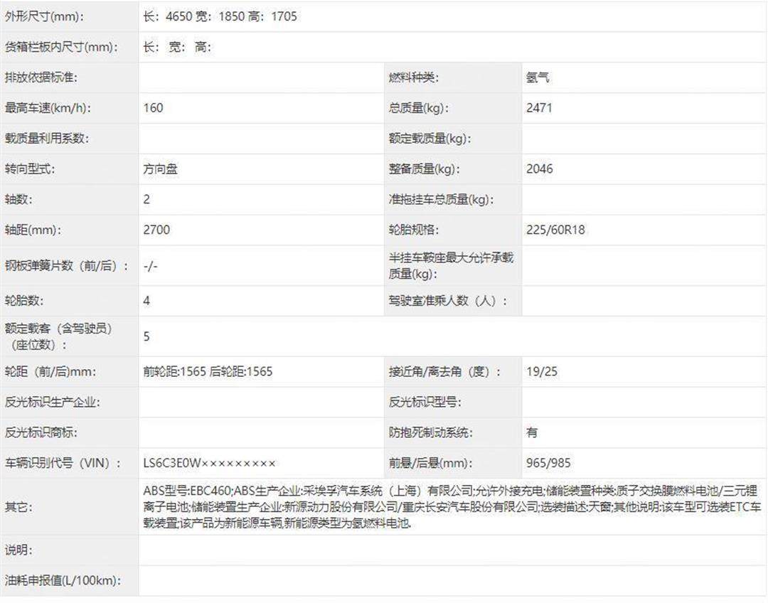 长安CS75 FCV的车身尺寸为4650/1850/1705mm,轴距2700mm;除了高度降低了10mm外,长安CS75 FCV与现款CS75基本相同。而大家最关心的动力方面,新车燃料种类为氢气,并采用质子交换燃料电池与三元锂电池储能,这套动力系统的最大功率能够达到218Ps。虽然信息中并未提供续航方面的信息,但根据早前已曝光的信息中提到,长安CS75 FCV的最大续航里程为510km(具体为氢450km+纯电60km)。