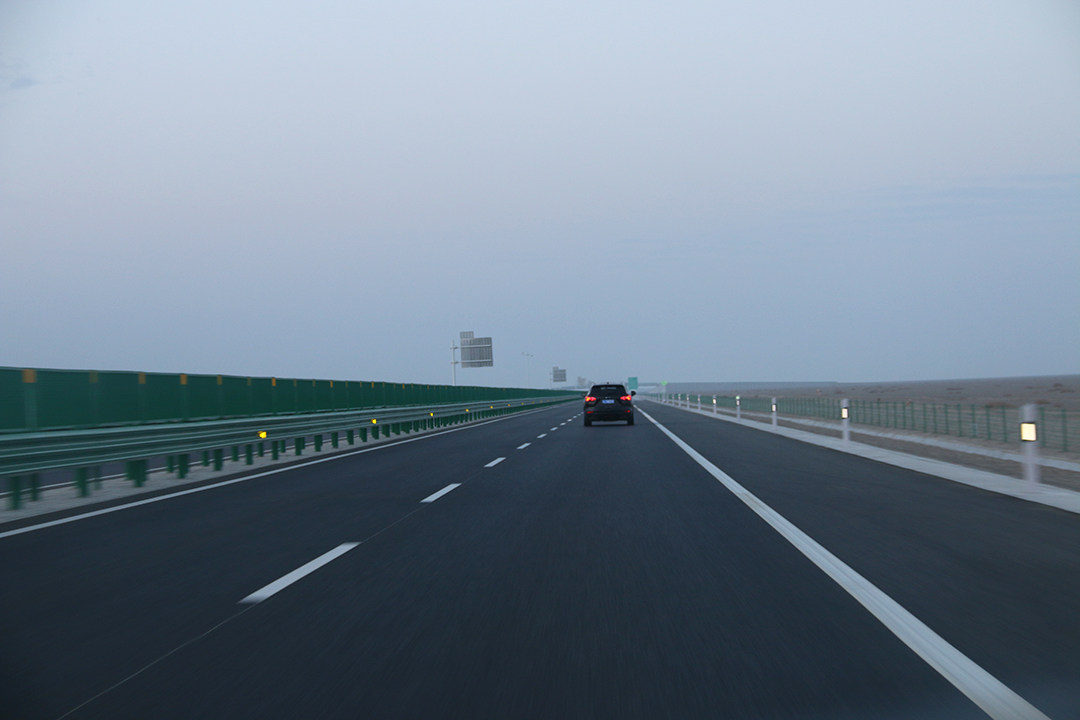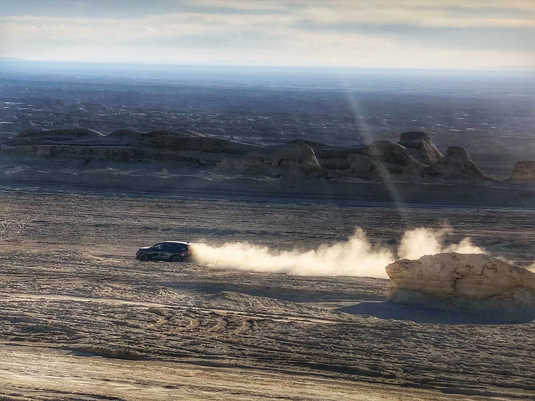 第一天由于需要赶路的原因,我们相对出发得较早,早上8点就已经开始发车了,别看时间好像并不算太早,其实这时候的敦煌还没开始天亮,月亮依然是处于抬头可见的状态。在道路上行驶当中,期间可以感受到这次探界者装配的9AT变速箱,而城市道路低速行驶时,可以感觉到换挡的顿挫是非常小的,且换挡响应更快。