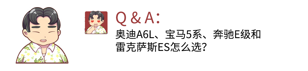 总结一句话:要可靠耐用、经济实惠的选择雷克萨斯ES,追求性价比、成熟稳重的选择奥迪A6L,注重豪华、档次的选择奔驰E级,追求更极致的驾乘感受就考虑宝马5系,其实它们一点都不矛盾,都有各自擅长的领域。