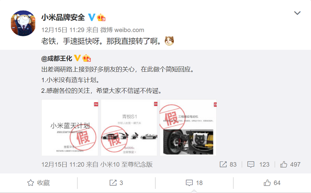 可能再次让许多网友失望,这次的消息还是假的!针对此次造谣事件,最先出来澄清的是@成都王化,并且小米官方@小米品牌安全 在第一时间转发,确认此次事件为造谣。