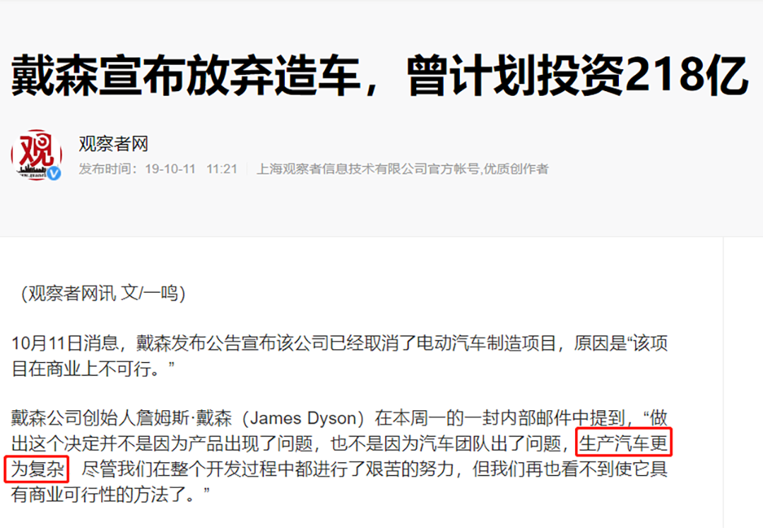 所谓隔行如隔山,想要跨行业进军汽车市场,除了办理汽车生产资质极难之外,小米既没有汽车研发技术,又没有与汽车厂商合作或收购,其投入成本之高、技术难度之大一目了然了。在这件事上也不是没有先例: Dyson戴森作为一家国际高端家电设计制造公司,背后的资金非常雄厚,曾经甚至计划投资200多亿进军汽车领域,但最后还是寥寥收场。