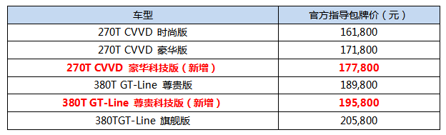 动力方面,270T CVVD 豪华科技版搭载全球独创第四代CVVD发动机技术,最大功率170马力,最大扭矩253牛米,百公里综合油耗仅5.6L;380T GT-Line 尊贵科技版最大功率240马力,最大扭矩353牛米,动力参数与豪华车型高功率版本持平。