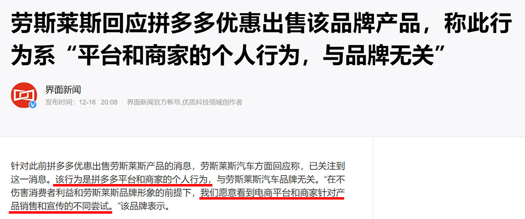 而就在昨天(12月17日),劳斯莱斯汽车官方回应称:“该行为是拼多多平台和商家的个人行为,与劳斯莱斯汽车品牌无关。在不伤害消费者利益和劳斯莱斯品牌形象的前提下,我们愿意看到电商平台和商家针对产品销售和宣传的不同尝试。”