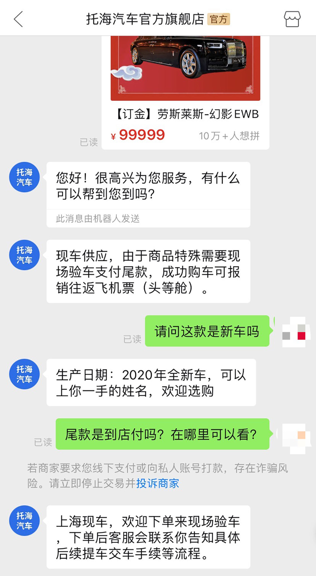 小编也尝试联系了该商家,商家称平台上的劳斯莱斯 幻影是今年的一手新车,且表示“成功购车可报销来回机票。” 其实在该商店里可以看到,除了这台幻影之外,剩余的11台汽车最贵也不过是30万左右。因此个人认为,商家通过上架这一款“天价商品”,打破平台卖小物件商品的常规操作,其关注度自然上去了。这样一来,一方面提升了拼多多在购物平台上的口碑,另一方面也为该商家带来了一大波流量,可以说这是一个双赢的局面。