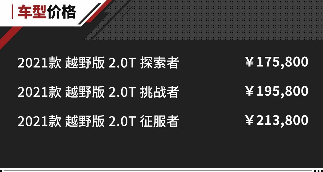 中配的坦克300是最具性价比优势的,也就是售价19.58万元的越野版2.0T挑战者版本。这一版本仅比入门的探索者版高出2万元,不过配置方面多出了前雷达、360全景影像、后桥差速锁、12.3英寸液晶仪表盘、底盘透视、自适应巡航、电动天窗等关键配置,舒适性配置方面则增加了氛围灯、皮质座椅、9扬声器系统等。总的来说坦克300的入门版本教授是不太推荐的,属于拉低售价区间的存在。