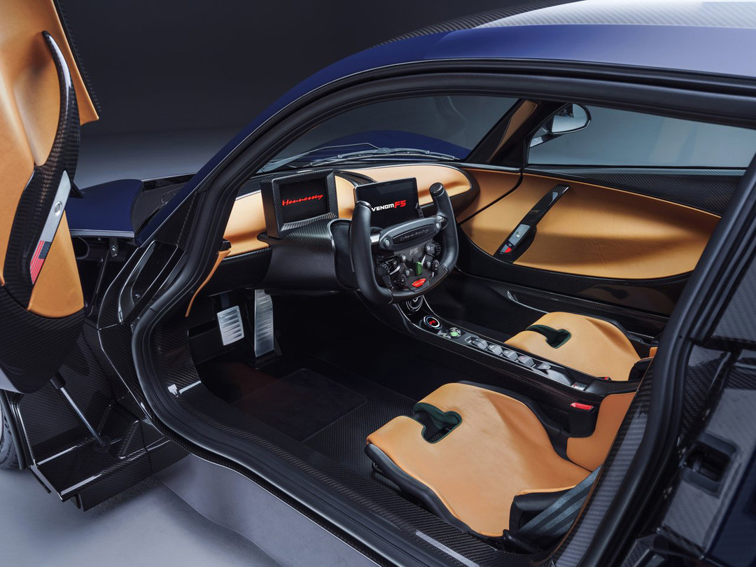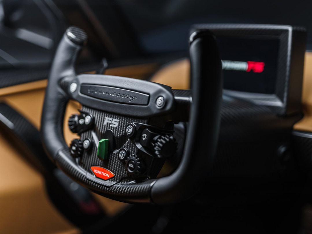 Hennessey的奢华,并不是说车辆内部有多么高级的皮革,也不是有多么耗时的手工,而是该车使用全碳纤维座舱,座舱内部几乎所有部件都使用碳纤维装饰,而且这种肯定不会是湿碳。此外,该车还拥有一个独立的全液晶仪表盘显示车辆的各种信息,搭配上半开放式的方向盘,氛围极其战斗,方向盘上集成了车辆行驶的基本功能,包括灯光、雨刷、转向灯以及驾驶模式等,为了轻量化,连换挡拨片都使用打孔设计。