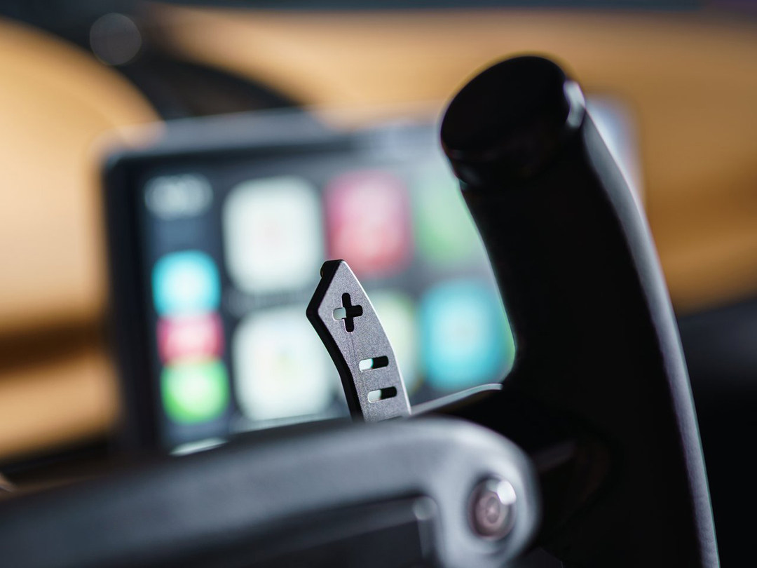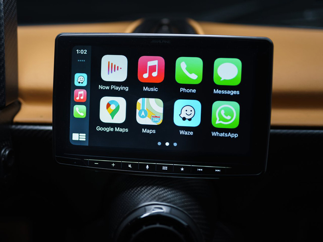 当然,既然是量产车,自然不能缺少娱乐系统和空调系统,该车通过中控屏去控制这部分功能,中控屏使用悬浮式设计,下方两个圆形的是车辆的空调出风口。车辆还配备了Carplay,究极跑车也有贴心的一面。细心的朋友可能会发现,空调出风口上方的碳纤维接缝处做得并不够完美,碳纤维纹路没有完全对齐,当然这也可能跟美国人粗枝大叶的做事风格有关。
