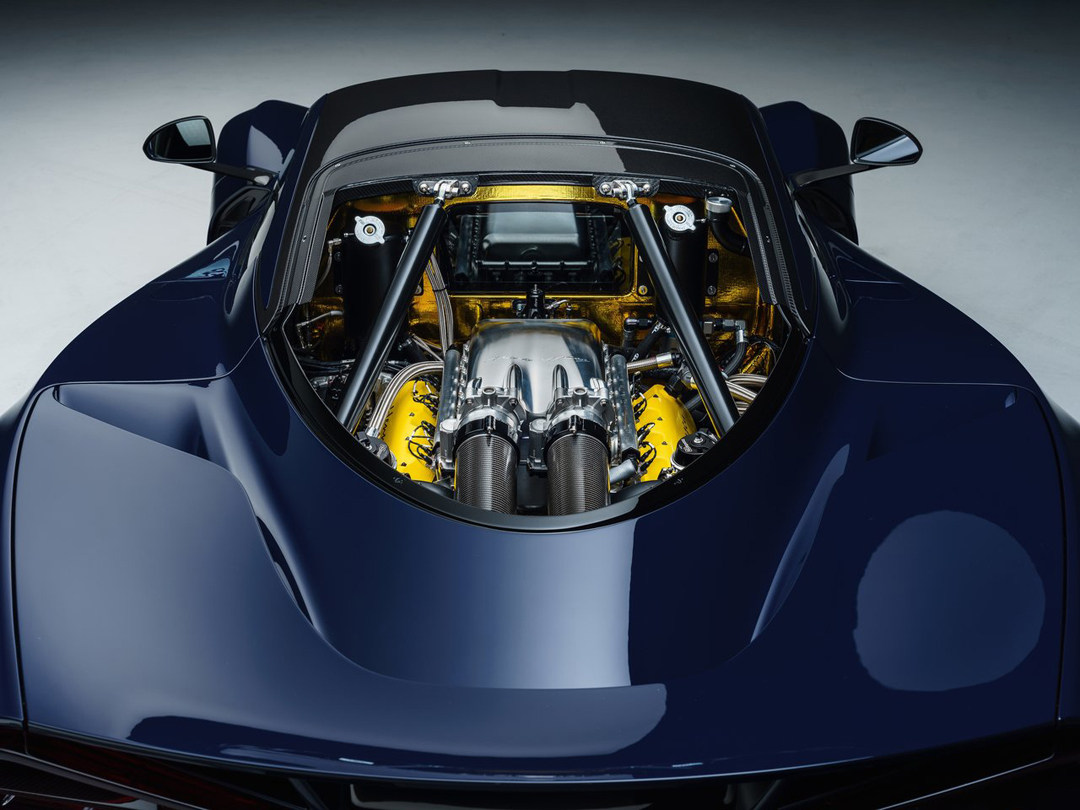 车尾部分,新车尾灯使用细小线条勾勒的设计,尾灯中央是镂空的散热开口,这一点比较有意思。后扰流板和车辆尾部融为一体,在如今超级跑车设计中,已经很难看到那些简单、粗暴的外置式尾翼了,取而代之的是更加融入车体的设计,并且部分带有空气刹车功能。此外,为了给车尾巨大的热源散热,车尾几乎没有覆盖件,通过凌厉的线条作为装饰,大量的镂空给热源与空气充分接触。