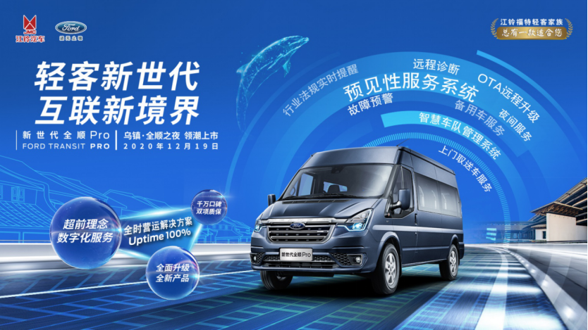 12月19日,江铃福特全新数字化轻客新世代全顺Pro在乌镇互联网国际会展中心正式上市,售价16.38万元起,凭借超前的数字化服务理念和智能化技术,新世代全顺Pro为轻客用户量身打造了“Uptime 100%全时营运解决方案”,引领轻客行业新变革。