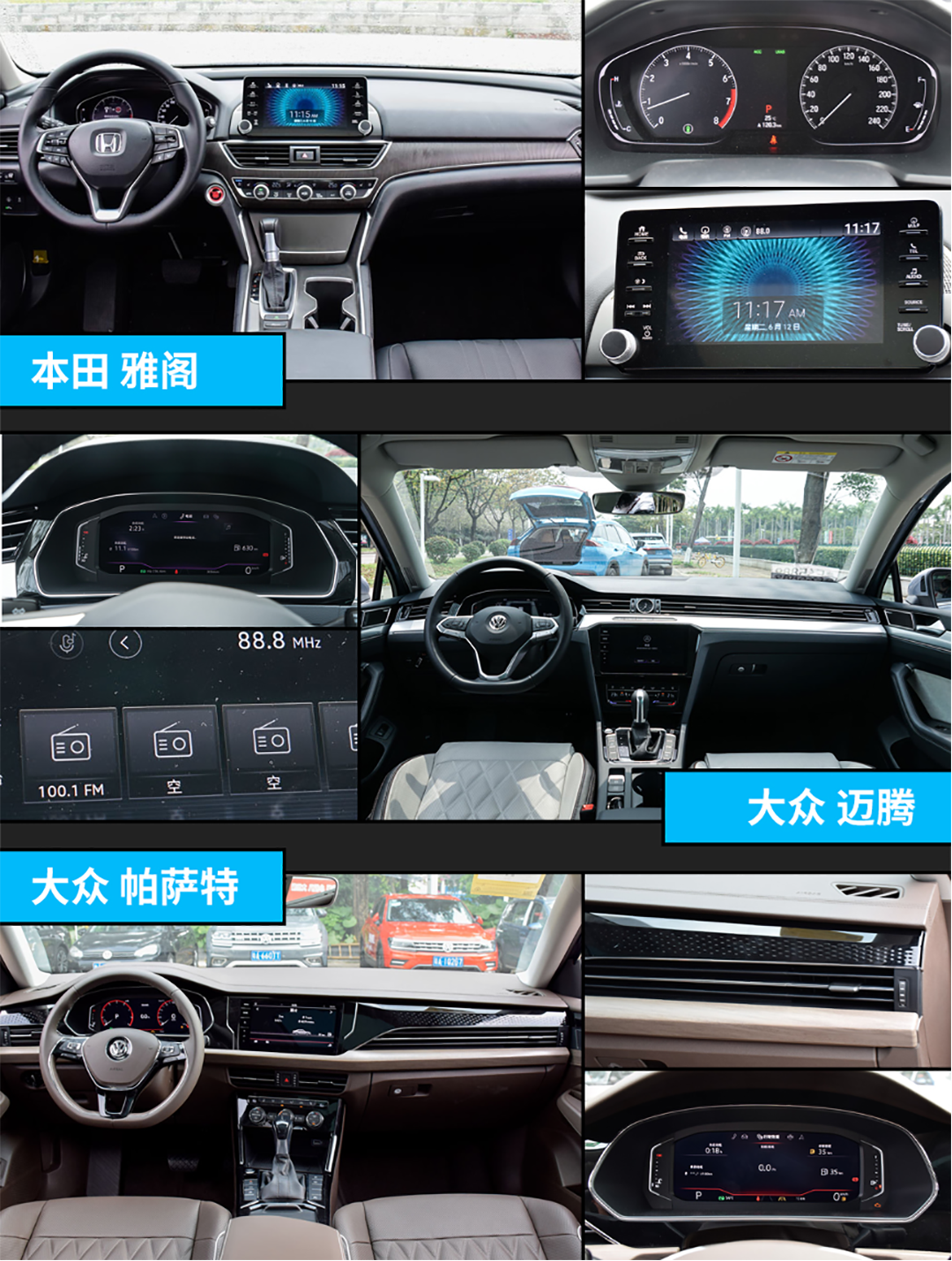 但看向内饰,我们纠结了…三者内饰设计各有千秋,均采用了传统的T字形布局,雅阁还配备悬浮式中控屏,整体其实颇有几分宝马3系的感觉。不过就做工而言,这两款大众车型更为精细,所以雅阁首先被排除了。