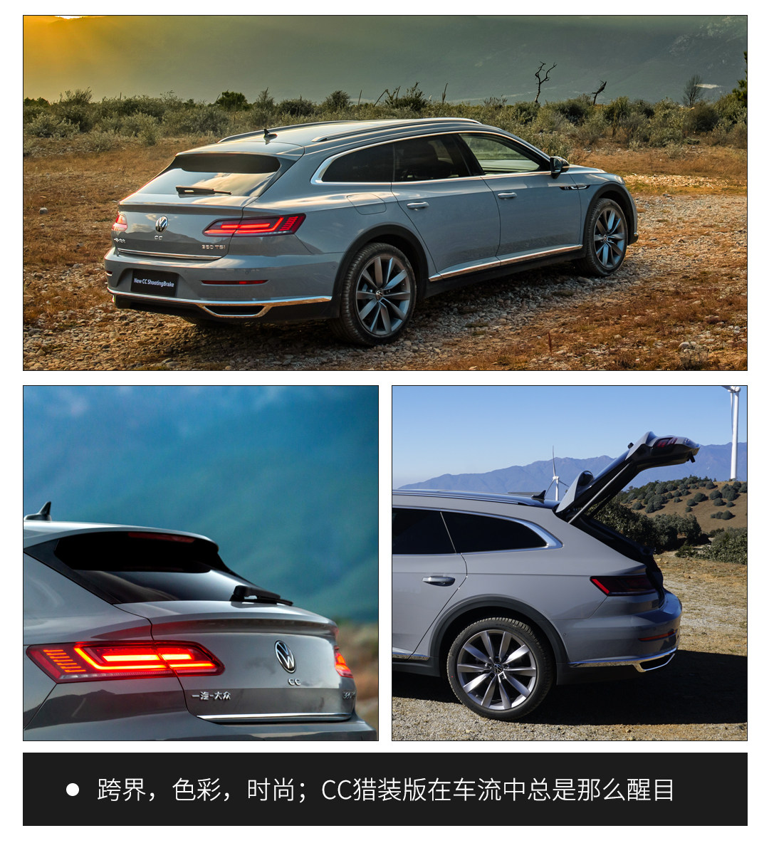 CC猎装方面则更强调“姿态”,猎装和旅行车的区别在于前者会更强调整体的线条,其次这也是非豪华品牌首次提出“猎装”概念,把“设计,实用,情怀”三方有机整合,开上CC猎装版,其他人的眼光就是它产品价值的最好定义。这种车标以外的东西才能更好提高CC面对豪华品牌时的优势。而价格上,猎装版也仅仅比轿跑版贵了7000元而已。