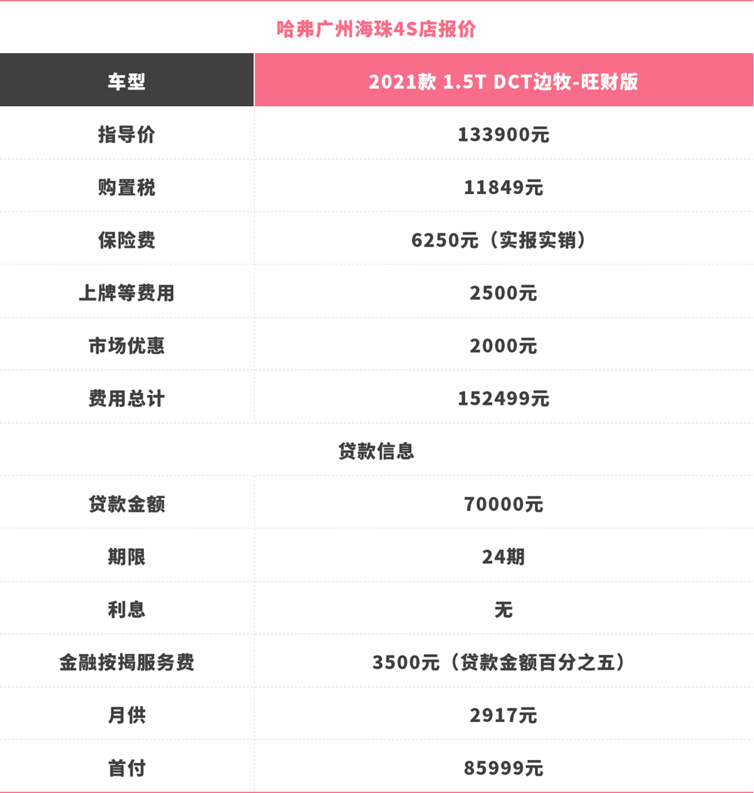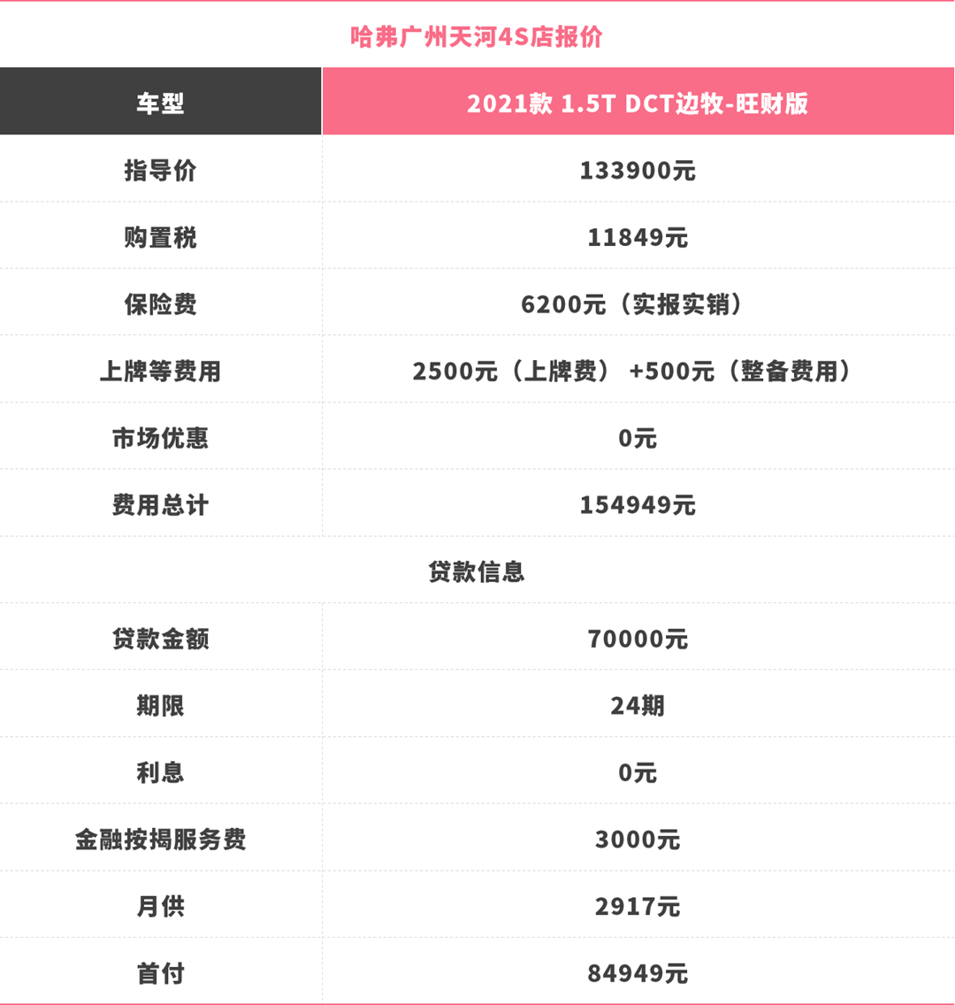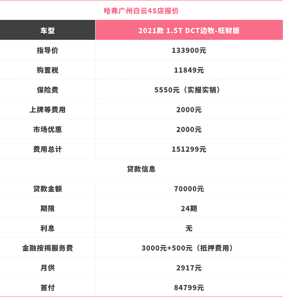 这是天河店报出的大狗1.5T DCT边牧旺财版的价格,并且做了24期的免息贷款。(为了控制月供3000元以内,三家店都仅贷款7万元)销售告知,目前大狗由于热度较高,所以车价方面没有优惠。上牌费为2500元,4S店另外还收取500元作为整备费用,如洗车、打蜡等。销售没有提及赠送,防爆膜与行车记录仪这些精品都需要加装套装的形式得到,总的来说价格较为坚挺。