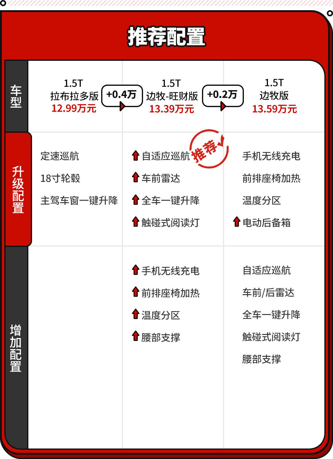 根据对比下来,笔者认为最具性价比的版本还是边牧-旺财版。如图所示,相较拉布拉多版的配置,边牧-旺财版售价仅高出4000元,不过配置则高出了一大截,远超4000元所能买到的价值。所以在到店之前,笔者确定了两个点,那就是购买边牧-旺财版以及月供3000元以内,看看实际所花费的费用到底多少。