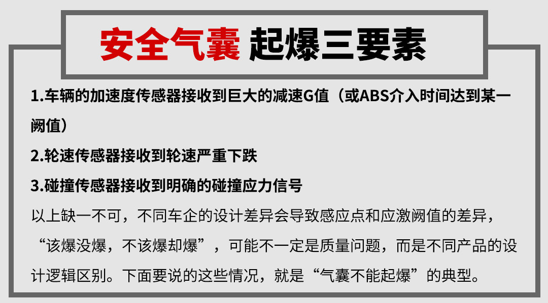 以上,是教授总结的部分日常“安全气囊不会爆”的情况,那接下来要说的,就是设计之初标定中安全气囊不会爆开的情况。而这部分,也是很多驾驶者会经常忽略的部分。