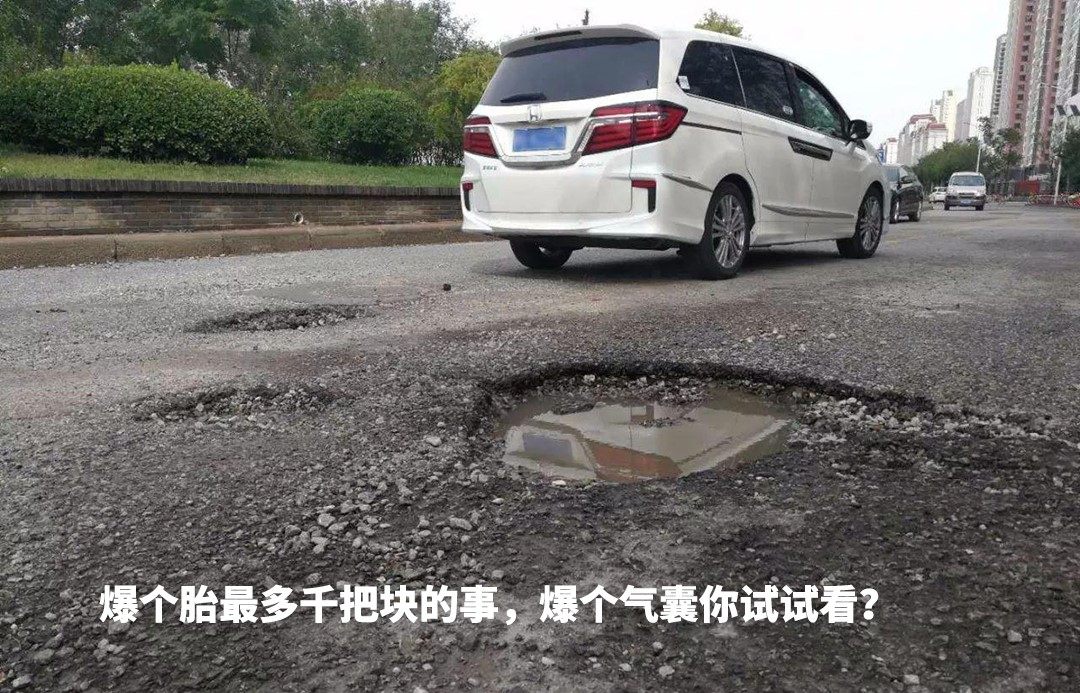 大晚上你在一段没有路灯的道路以50km时速行驶,边开边抱怨自己的车为啥没有激光大灯,一不留神前面路上有个坑,50km过去,嘭!轮胎爆了,但气囊不能爆,爆了可能你方向盘都握不住,只能去路边的池塘或者田埂里找人。
