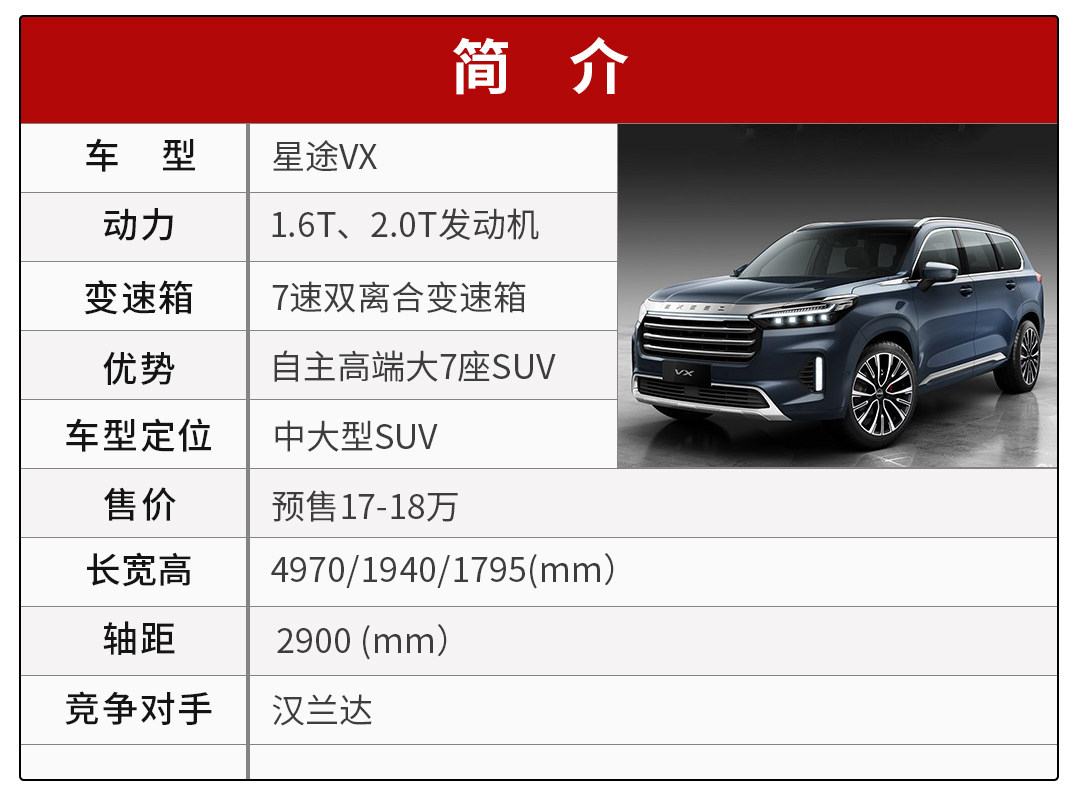 作为星途的旗舰车型,星途VX则主打大7座SUV车型。目前来说,类似领克和WEY还没在7座SUV车型细分领域中布局,这对于星途VX来说或许有着先入为主的小优势。在动力核心方面上,新车将会搭载1.6T和2.0T两种动力系统,前者的1.6T发动机在奇瑞整个品牌车型下都在广泛使用当中,与格特拉克7速湿式双离合变速箱配合,整体的动力输出和燃油经济性上的表现则是有目共睹。