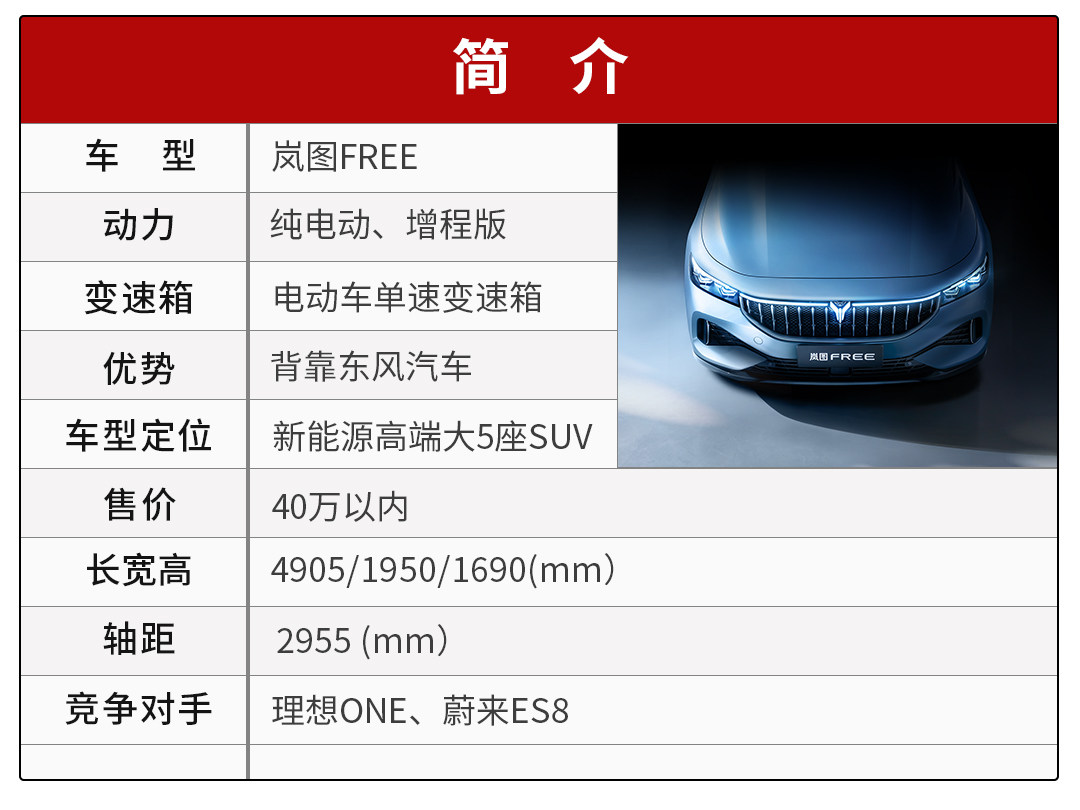 可能大家对岚图这家品牌不是很熟悉,事实上,该车企是东风汽车倾力打造的新能源高端品牌,而岚图FREE则是该品牌的第一款车型。我们先来看下这款新车的一些亮点,新车定位于中大型SUV,内外设计水准符合高端品牌的定位。未来将提供纯电版和增程版,扩大消费者适配人群,后者最高续航里程可达到860km,预计售价不超过40万。这定位这价格,可以想象到岚图FREE以后会面对理想ONE以及蔚来ES8这些竞争车型。