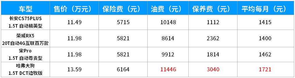 综上来看,按一年行驶2万公里来计算,哈弗大狗 1.5T DCT边牧版一年的保养费、保险和油费分别为3040元、6164和11446元,一年的养车总费用大概20650元,每月平均约为1721元,每公里平均约1.03元。