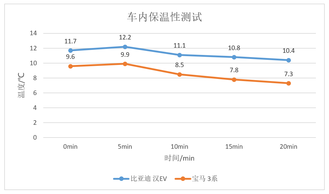 由于比亚迪汉EV整车实现了完整的三道密封,且采用福耀定制的双银镀膜挡风玻璃,使得车内的气密性和保温隔热有更好的效果。出于好奇,在测试完空调制热效果之后,教授将两车空调全部关闭,测试20分钟内车内的保温性。